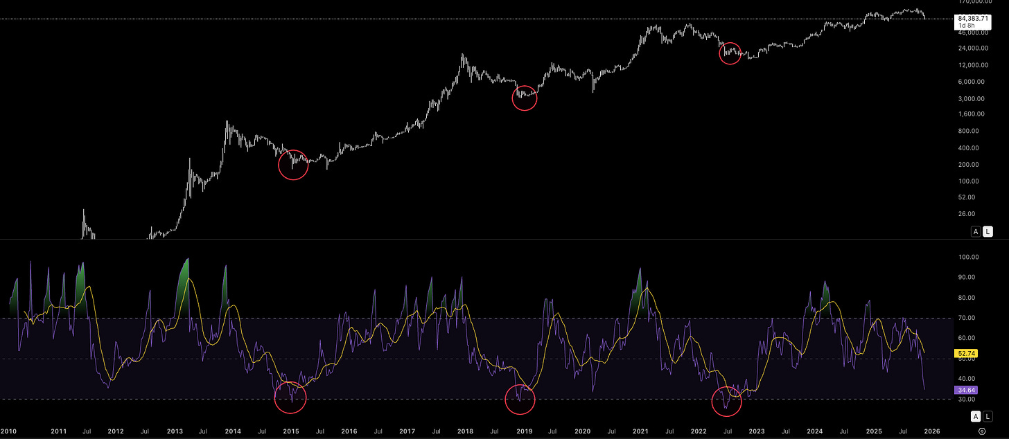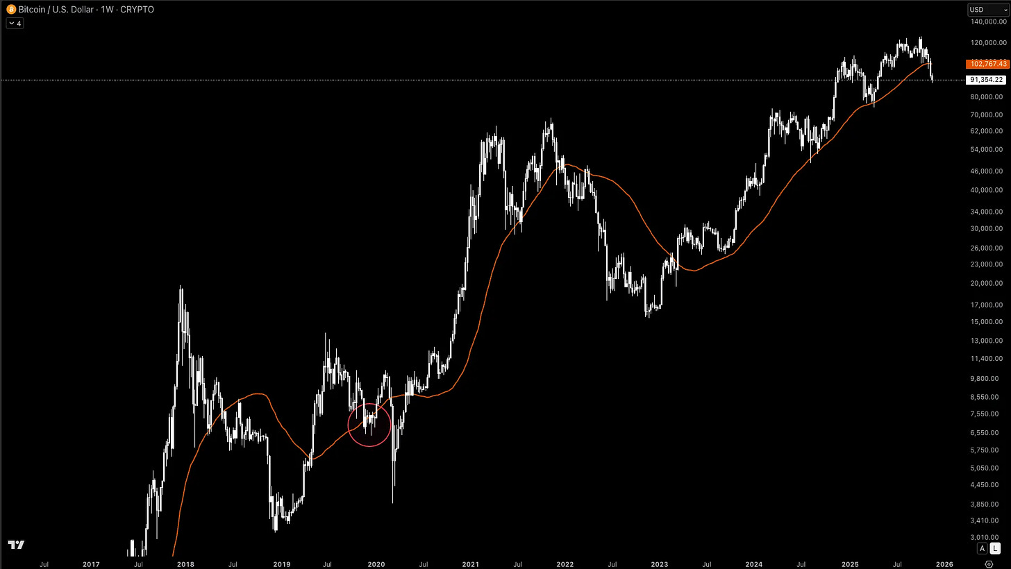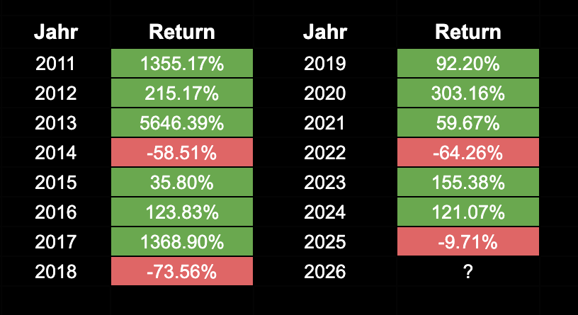 Kommen wir zurück zu unserer 4-Jahres-Zyklustheorie. Normalerweise sehen wir seit 15 Jahren dasselbe Muster: drei grüne Bullenmarktjahre (positive Rendite), gefolgt von einem roten Bärenmarktjahr (negative Rendite). Aktuell notiert Bitcoin unterhalb seines Jahreseröffnungskurses. Dementsprechend ist 2025 Stand jetzt ein Jahr mit negativer Rendite, obwohl es eigentlich laut Zyklustheorie unser finales Bullenmarktjahr darstellen sollte.
