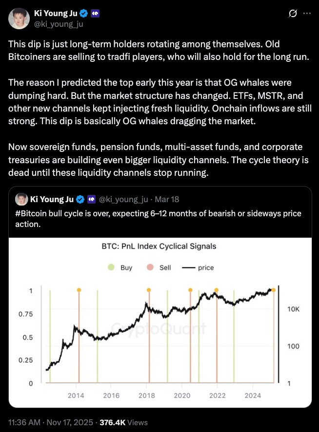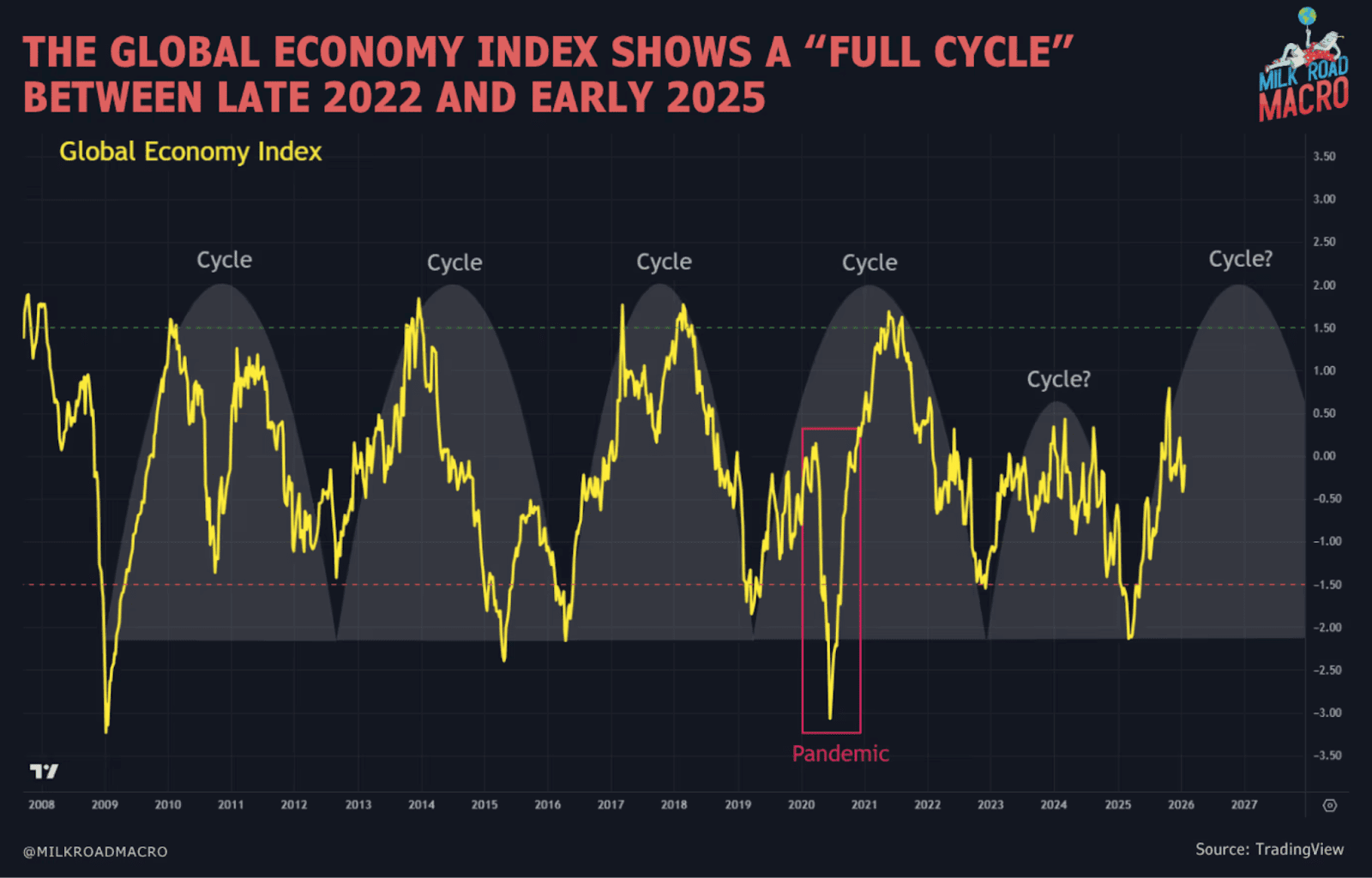 Bezüglich unserer Zyklustheorie gibt es interessanterweise führende Makro-Analysten, die sagen, dass es möglich sei, dass wir am Anfang eines brandneuen Liquiditätszyklus stehen könnten. Demzufolge könnten wir einen vollen Zyklus von 2022 bis Anfang 2025 gesehen haben, der Anfang 2025 mit dem zollgetriebenen Wachstumsschock endete. Erinnerst du dich? Das war genau dann, als der Founder von CryptoQuant sagte, dass wir uns jetzt in einem Bärenmarkt befänden und bearishe Price Action prognostizierte.