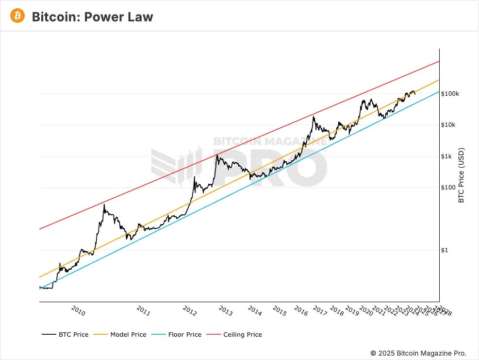Seit 16 Jahren verfolgt Bitcoin den Trendkanal ohne Ausnahme. Auch wenn es kein Garant auf zukünftigen Preisverlauf bietet, so ist das Power-Law-Modell das beste und wissenschaftlich akkurateste, was wir in Bezug auf Bitcoins Preis haben.