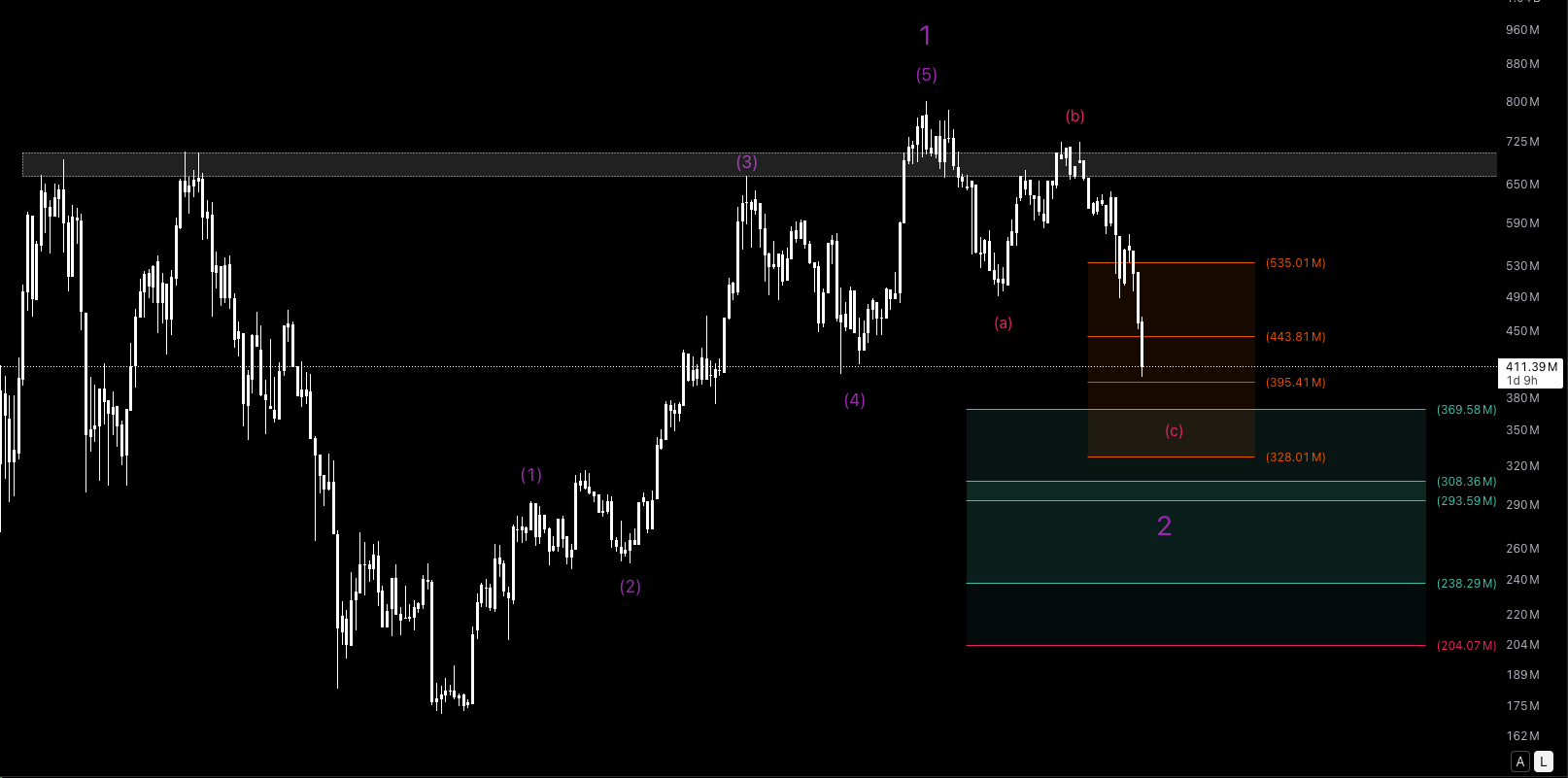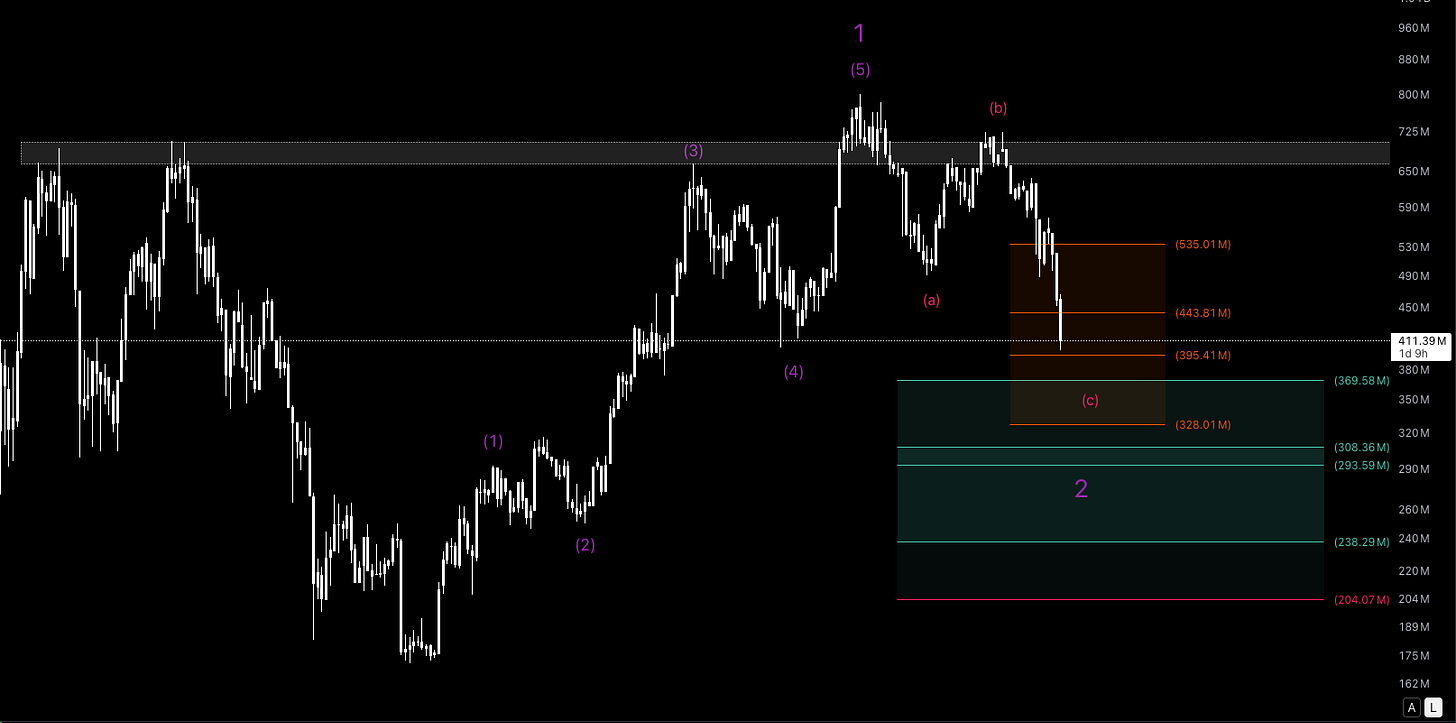 Nach einer solchen Korrektivstruktur erwartet man einen starken, übergeordneten Ausbruch zu Oberseite. Laut Fahrplan befänden wir uns in den letzten Etappen der finalen Abwärtsbewegung.