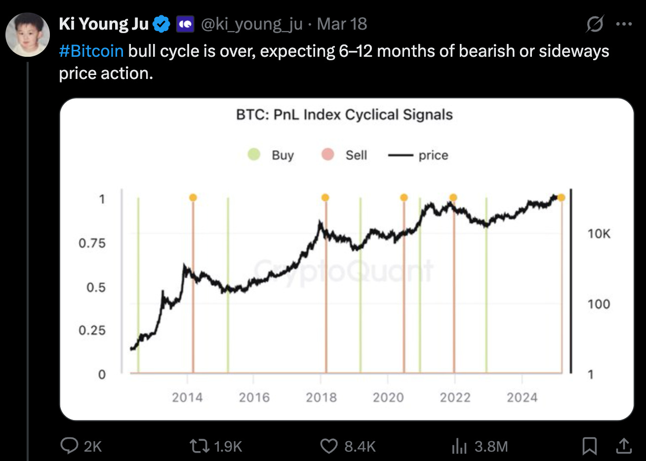 Die nächste Anomalie trat am 18. März 2025 auf, als der Founder des führenden On-Chain-Unternehmens CryptoQuant auf einmal den Bärenmarkt ausrief. Mit den Worten „Every on-chain metric signals a bear market“ prognostizierte er sehr selbstsicher 6–12 Monate bärischen oder seitwärtsgerichteten Preisverlauf.