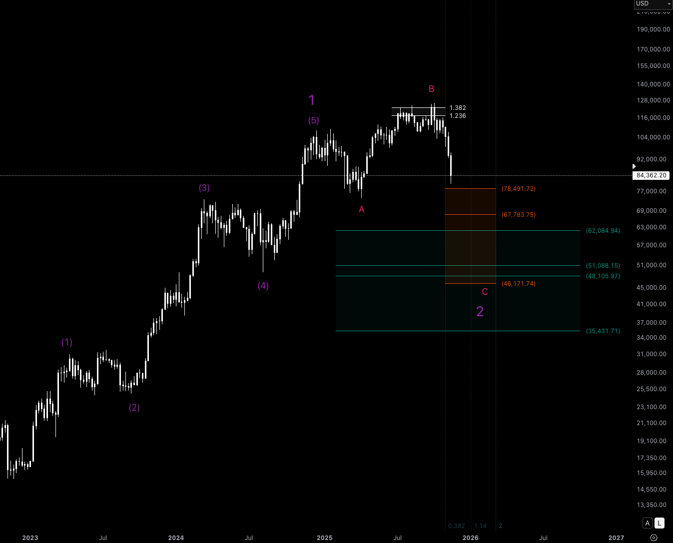 Nutzen wir die chartechnischen Werkzeuge, ergibt sich ein optimaler Zeitraum für die Bodenbildung zwischen Januar-März 2026 und ein optimales Kursniveau von $67.000-51.000. Persönlich würde ich es eher auf $67.000-62.000 eingrenzen.